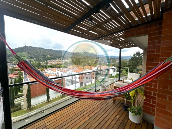 Apartamento en El Retiro con deck cubierto amplio, vista despejada a montañas y pueblo, zona plana caminable al parque y alta demanda por ubicación y entorno natural.