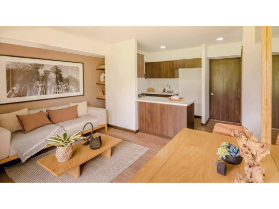 Área 57.56 m2 full acabados modernos, con 2 alcobas, 3 closet, sala comedor, cocina integral con barra americana, balcón con una inigualable vista hacia las montañas, zona de ropas independiente, parqueadero y cuarto útil.